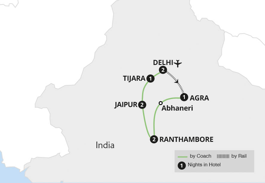 Embrace the spirit of northern India on a journey around majestic Rajasthan and the magical Golden Triangle. Experience the bustling bazaars of Delhi on a rickshaw ride, marvel at Agra's iconic Taj Mahal, visit the spellbinding Chand Baori stepwell and uncover Jaipur's ethereal Amber Fort by Jeep. In the untamed wilderness of Ranthambore...