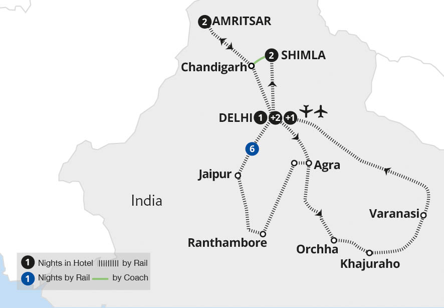 Retrace the steps of Indian princes aboard the Maharajas' Express - one of the world's most luxurious trains. Starting and ending in Delhi, this incredible voyage of discovery visits the former colonial summer capital of Shimla before showcasing spellbinding Amritsar as we witness the Wagah Border Ceremony and the Palki procession at the...