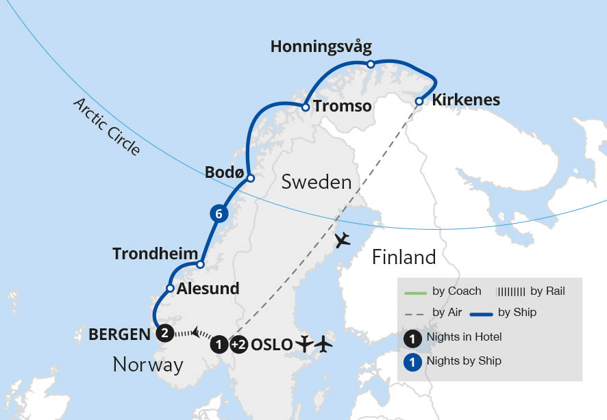 Discover glorious Norway in summertime, with guided tours and time to explore vibrant Oslo and charming Bergen before embarking on a six-night Arctic cruise through some of the world's most magical fjords. On our epic voyage north we mark the crossing of the Arctic Circle with a ceremony, then continue into Norway's Arctic region, ...
