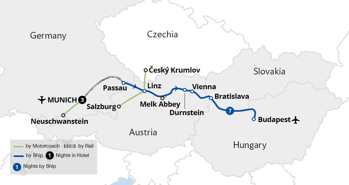 From beautiful Bavaria to the glorious surroundings of the Wachau Valley and Europe's fantastic cities, this tour and cruise holiday is a showcase of diverse scenery.     The experience begins on land, with three days in Munich in the heart of Bavaria. Our time here takes us to Neuschwanstein Castle and introduces Munich's highlights and...