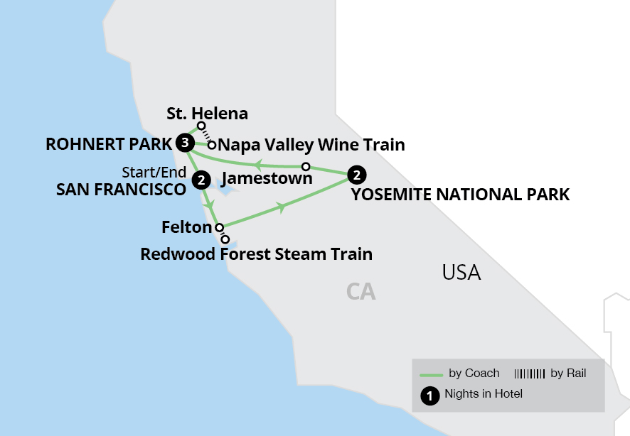 California is a land of possibilities, and this unforgettable tour showcases some of its greatest offerings. Soak up the modern and historic sides of San Francisco and travel into nature, where towering redwood trees surround us on the Redwood Forest steam train. Then, admire the mountain and waterfall panoramas of Yosemite National Park...