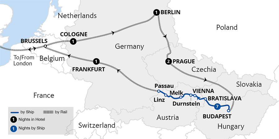 Embrace the storied past of grand empires on a captivating rail-and-cruise holiday. Starting in the German capital of Berlin, uncover the magic of Prague from its sprawling capital and enchanting Charles Bridge. Absorb panoramic views of Budapest's grand architecture on an illuminated evening cruise before setting sail for the fascinating ...