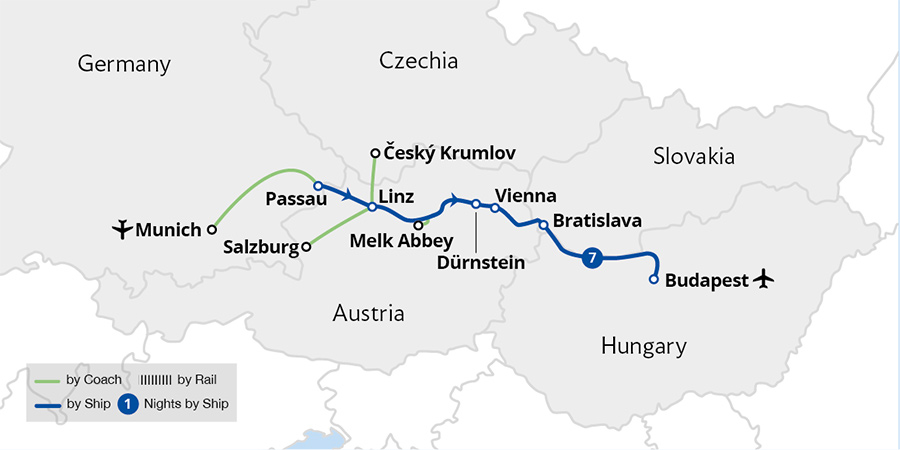 Fly to and from Munich to enjoy a leisurely cruise through four countries and three capital cities, basking in beautiful river scenery all the way. Sail from the German border town of Passau through the Austrian wine-growing region of the Wachau Valley, admiring picturesque Dürnstein and commanding Melk Abbey enroute. After exploring ...