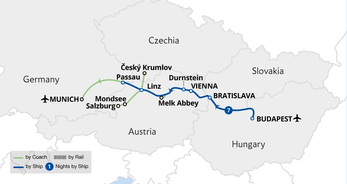 Enjoy an eight-day fly-cruise holiday through four countries and three capital cities, basking in beautiful river scenery all the way. With flights to and from Munich, sail from the German border town of Passau through the Austrian wine-growing region of the Wachau Valley, admiring picturesque Dürnstein and commanding Melk Abbey enroute.