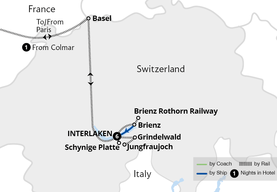Your GRJ All Inclusive Swiss adventure begins at London St Pancras where we meet the Tour Manager before boarding the Eurostar in Plus class, with a light meal served at our seats on the way to Paris. In the French capital, we continue by First Class rail to Colmar, the capital of the Alsace wine region.