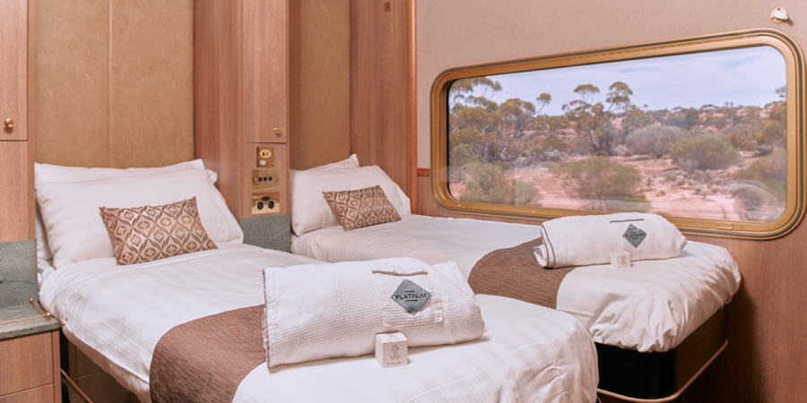 Travel through the Land Down Under in unmatched elegance in The Ghan's Platinum cabins. Each is set up lounge-style by day, featuring banquet seating, ottomans and a movable table, and with either a double bed or two twins at night. Marvel at the changing route from windows on both sides of the cabin and enjoy attentive, personalised service. Complete with a full-sized en-suite bathroom, top-tier toiletries and complimentary nightcaps each evening, each detail is better than the last.